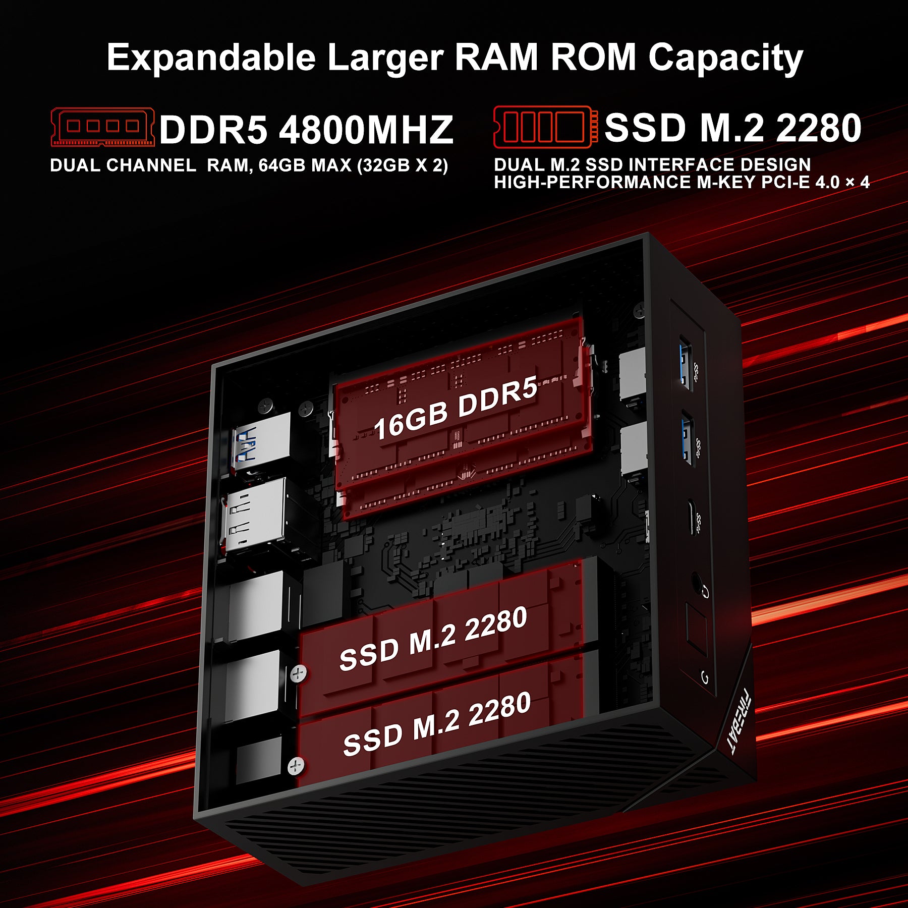 - Expandable Larger Capacity -- FIREBAT AMD mini PC is powerful and compact, equipped with 16GB 4800MHz RAM and 512GB M.2 2280 SSD which has better performance and quality. Built-in dual-channel memory interface, maximum support expansion to 64GB RAM (32GB x 2), dual M.2 SSD hard drive interface design, support for higher performance M-KEY PCI-E 4.0 × 4. Dramatically improve pc performance, especially in high-load tasks.