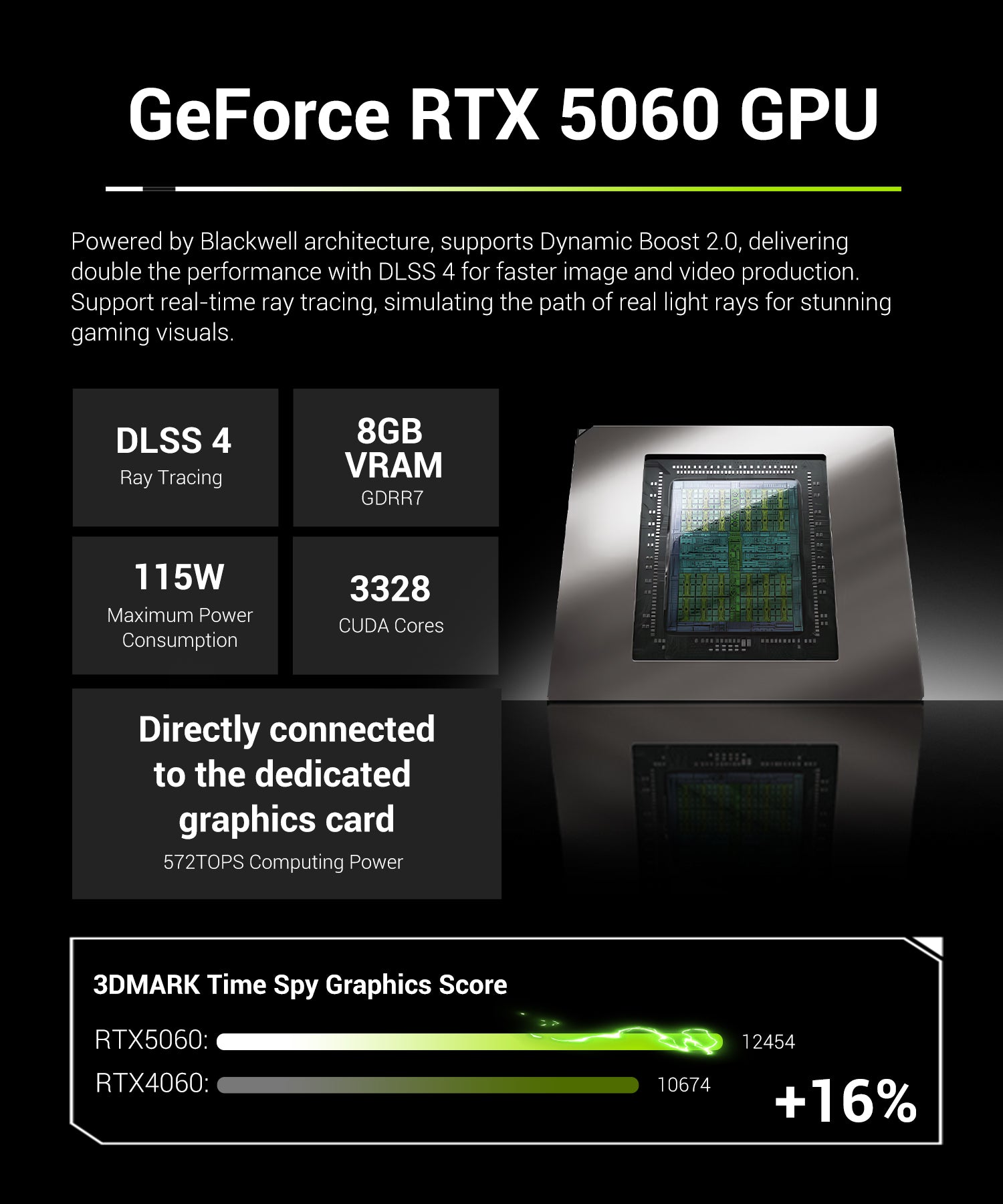 - Cinematic Quality at Unprecedented Speeds -- FIREBAT gaming pc is equipped with the 2025 latest RTX 5060 laptop GPU, which is powered by the Blackwell architecture, delivering up to 572 TOPS of AI-powered performance, unlocking transformative real-world experiences with full ray tracing. Featuring a 16-inch 16:10 25601600 240Hz 300nits(cd/m²) brightness IPS display, delivering stunning image and sound quality, with an RGB Backlit keyboard, making it ideal for high-resolution, high-refresh gaming.