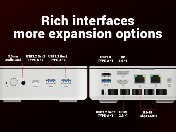 - More Interfaces with Faster Connections -- FIREBAT mini gaming PC is equipped with 1 x USB-C 3.2(PD 100W/DP 1.4/DATA, Up to 10Gbps), 3 x USB-A 3.2 10Gbps, 1 x USB-A 2.0, 1 x DP 2.0 (4K 160Hz ) + 1 x HDMI 2.1 (4K 60Hz), 3.5mm audio jack(HP&MIC), 2 x 1Gbps LAN, Wi-Fi 6 (802.11ax), Bluetooth 5.2, easily paired with various devices for ultra-faster connection, more smooth streaming. For all your needs, taking up no desk space.