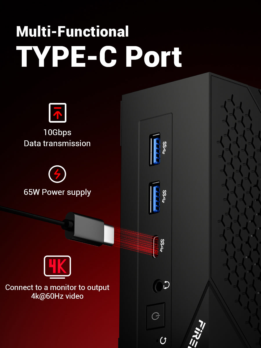 - More Interfaces with Faster Connections -- FIREBAT mini pc is equipped with Type-C 3.2x1(PD/DP/DATA, up to 10Gbps/S), USB3.2x3(up to 10Gbps/S), USB2.0x1, DP2.0(4K@160Hz)x1, HDMI(4K@60Hz)×1, 3.5mm audio(HP&MIC), dual LAN, WiFi 6 plus built-in Bluetooth 5.2, easily paired with various devices for ultra-faster connection, more smooth streaming and faster downloading. Allows to connect dual 4K displays simultaneously, with 1900MHz AMD graphics, providing UHD video output and flexible multitasking.
