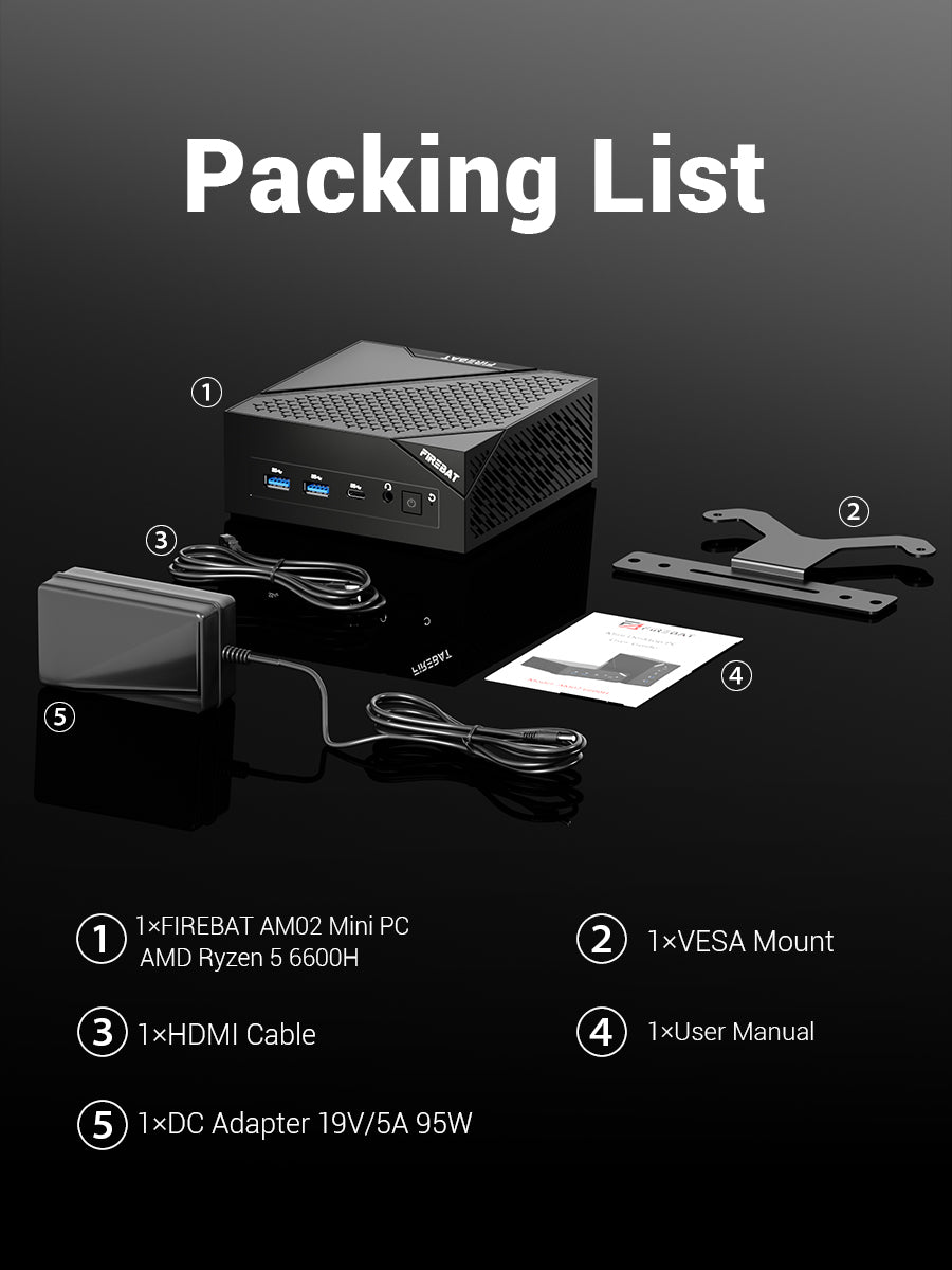 - Multi-threaded Task Processing -- FIREBAT mini PC uses the newly upgraded AMD Radeon 660M 1900MHz GPU, which is an upgrade to the previous generation AMD RX Vega 8, faster data processing, and is more suitable for a large number of multi-threaded task processing. It Can easily handle the needs of complex design software, UHD video editing and playback, graphics processing, and games. It can also connect to 3 displays at the same time (DP 2.0, 4K@160Hz; HDMI 2.1 TMDS, 4K@60Hz).